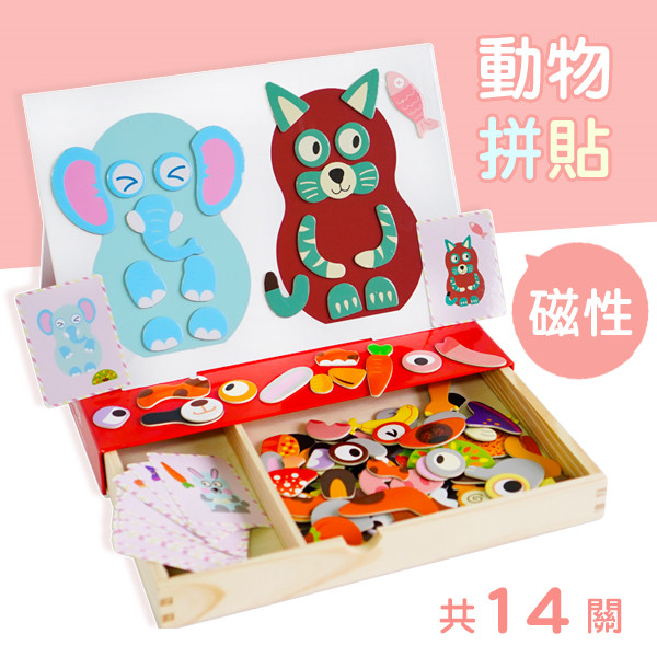材質:厚紙+木盒/包裝尺寸:30x22x4cm 14關卡磁力拼拼樂,多種可愛動物圖案卡片,給小朋友練習認識動物造型,挑戰尋找對的五官配件。