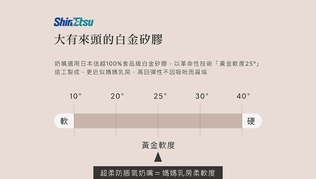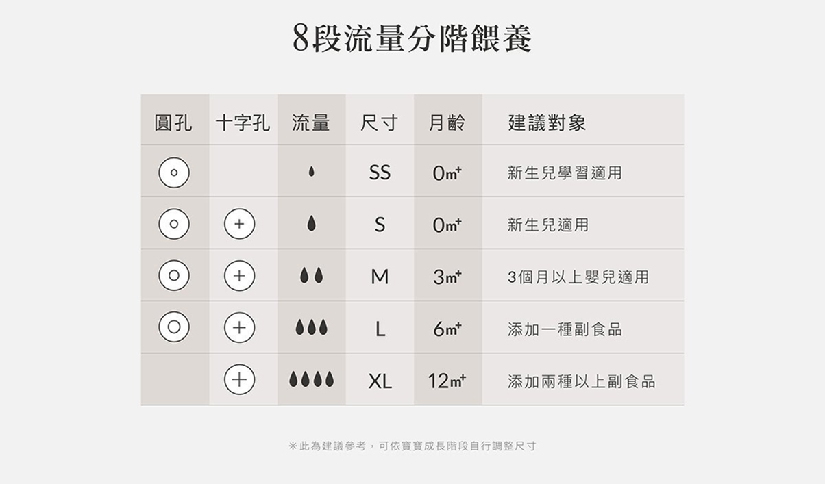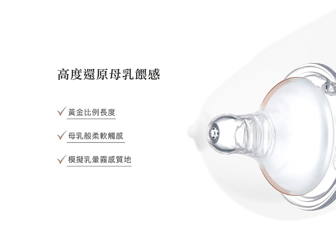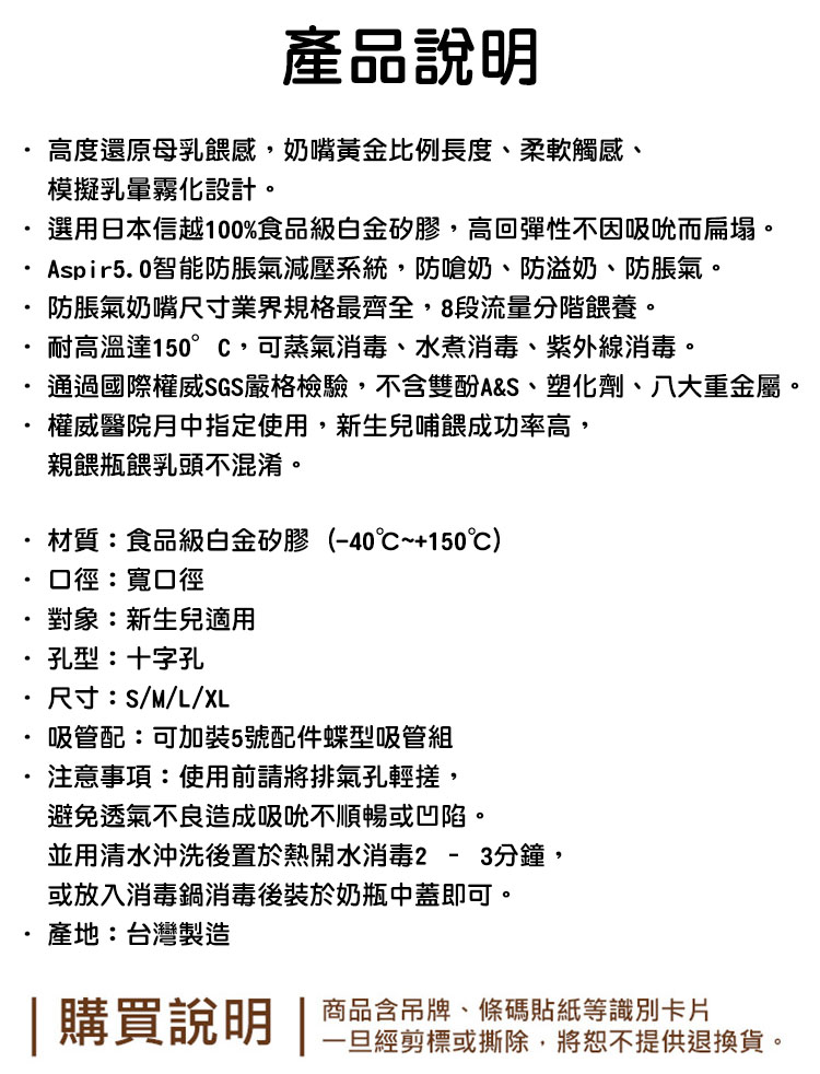 【商品特色】高度還原母乳餵感,奶嘴黃金比例長度、柔軟觸感、模擬乳暈霧化設計。選用日本信越100%食品級白金矽膠,高回彈性不因吸吮而扁塌。Aspir5.0智能防脹氣減壓系統,防嗆奶、防溢奶、防脹氣。防脹氣奶嘴尺寸業界規格最齊全,8段流量分階餵養。耐高溫達150°C,可蒸氣消毒、水煮消毒、紫外線消毒。通過國際權威SGS嚴格檢驗,不含雙酚A&S、塑化劑、八大重金屬。權威醫院月中指定使用,新生兒哺餵成功率高,親餵瓶餵乳頭不混淆。【商品規格】材質:食品級白金矽膠 (-40℃~+150℃),商品尺寸:十字孔S/M/L/XL