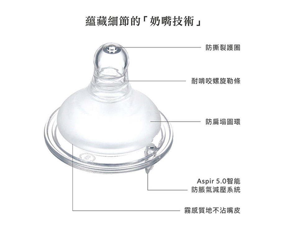 【商品特色】高度還原母乳餵感,奶嘴黃金比例長度、柔軟觸感、模擬乳暈霧化設計。選用日本信越100%食品級白金矽膠,高回彈性不因吸吮而扁塌。Aspir5.0智能防脹氣減壓系統,防嗆奶、防溢奶、防脹氣。防脹氣奶嘴尺寸業界規格最齊全,8段流量分階餵養。耐高溫達150°C,可蒸氣消毒、水煮消毒、紫外線消毒。通過國際權威SGS嚴格檢驗,不含雙酚A&S、塑化劑、八大重金屬。權威醫院月中指定使用,新生兒哺餵成功率高,親餵瓶餵乳頭不混淆。【商品規格】材質:食品級白金矽膠 (-40℃~+150℃),商品尺寸:圓孔SS/S/M/L