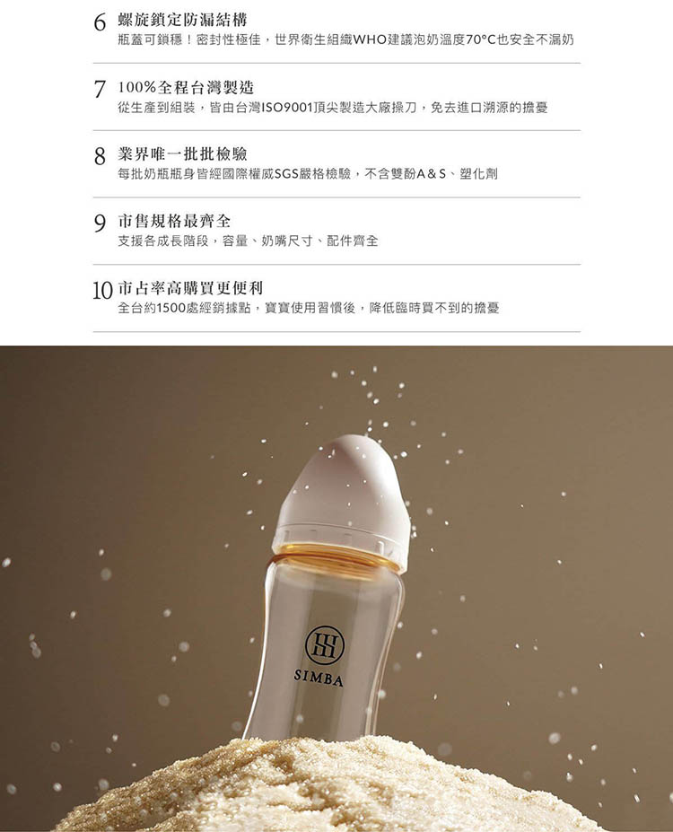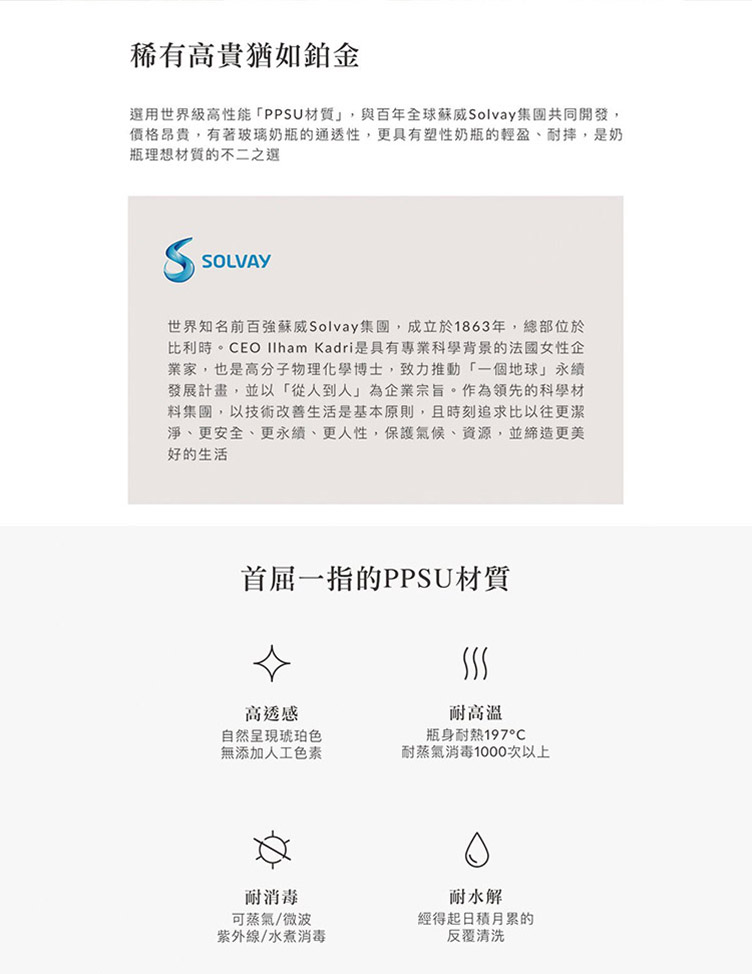 【商品特色】為新生兒打造白金級奶嘴,擬造媽媽乳房觸感。Aspir5.0智能防脹氣減壓系統,防嗆奶、防溢奶、防脹氣。權威醫院唯一指定,新生兒哺餵成功率高。100%全程台灣製造,免去進口溯源的擔憂。獨家首創一瓶八用!分階段科學餵養:儲乳、餵乳、學飲。奶瓶容量、奶嘴尺寸、配件業界規格最齊全。業界唯一每批奶瓶瓶身經國際權威SGS嚴格檢驗,不含雙酚A&S、塑化劑。螺旋鎖定防漏結構,世界衛生組織WHO建議泡奶溫度70°C也不漏奶。【商品規格】材質:奶瓶蓋 ‧ 中蓋:聚丙烯(-20℃~+100℃)/奶瓶:聚亞苯基碸(-20℃~+197℃)/防脹氣奶嘴:矽膠(-40℃~+150℃),商品容量:200ml