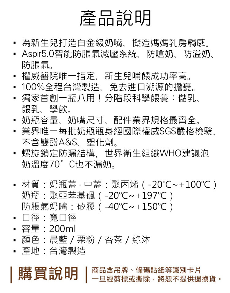 【商品特色】為新生兒打造白金級奶嘴,擬造媽媽乳房觸感。Aspir5.0智能防脹氣減壓系統,防嗆奶、防溢奶、防脹氣。權威醫院唯一指定,新生兒哺餵成功率高。100%全程台灣製造,免去進口溯源的擔憂。獨家首創一瓶八用!分階段科學餵養:儲乳、餵乳、學飲。奶瓶容量、奶嘴尺寸、配件業界規格最齊全。業界唯一每批奶瓶瓶身經國際權威SGS嚴格檢驗,不含雙酚A&S、塑化劑。螺旋鎖定防漏結構,世界衛生組織WHO建議泡奶溫度70°C也不漏奶。【商品規格】材質:奶瓶蓋 ‧ 中蓋:聚丙烯(-20℃~+100℃)/奶瓶:聚亞苯基碸(-20℃~+197℃)/防脹氣奶嘴:矽膠(-40℃~+150℃),商品容量:200ml