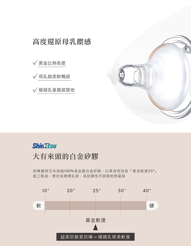 【商品特色】為新生兒打造白金級奶嘴,擬造媽媽乳房觸感。Aspir5.0智能防脹氣減壓系統,防嗆奶、防溢奶、防脹氣。權威醫院唯一指定,新生兒哺餵成功率高。100%全程台灣製造,免去進口溯源的擔憂。獨家首創一瓶八用!分階段科學餵養:儲乳、餵乳、學飲。奶瓶容量、奶嘴尺寸、配件業界規格最齊全。業界唯一每批奶瓶瓶身經國際權威SGS嚴格檢驗,不含雙酚A&S、塑化劑。螺旋鎖定防漏結構,世界衛生組織WHO建議泡奶溫度70°C也不漏奶。【商品規格】材質:奶瓶蓋 ‧ 中蓋 ‧ 把手 ‧ 吸片:聚丙烯(-20℃~+100℃)/奶瓶:聚亞苯基碸(-20℃~+197℃)/防脹氣奶嘴:矽膠(-40℃~+150℃)/吸管:矽膠(-20℃~+120℃)/導管珠:聚丙烯 ‧ 不鏽鋼(-20℃~+100℃),商品容量:270ml