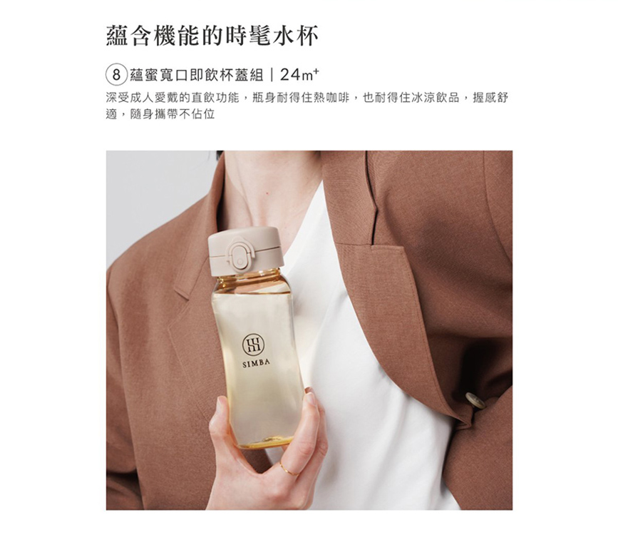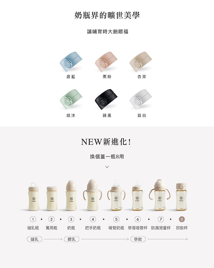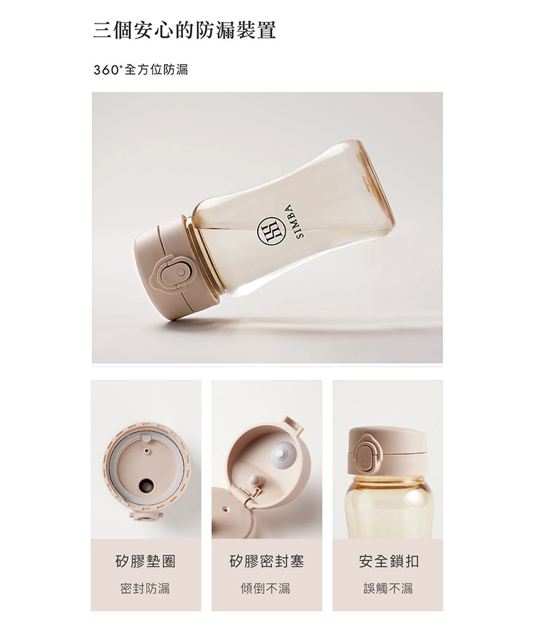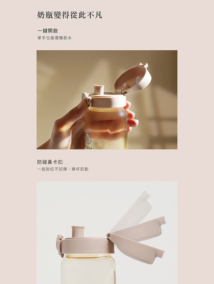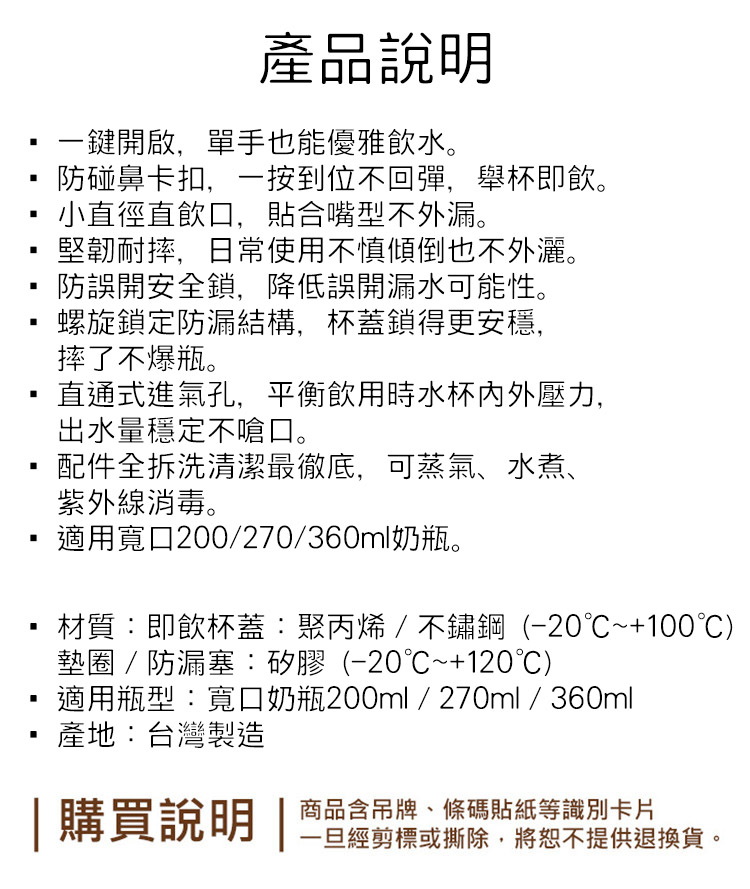【商品特色】一鍵開啟,單手也能優雅飲水。防碰鼻卡扣,一按到位不回彈,舉杯即飲。小直徑直飲口,貼合嘴型不外漏。堅韌耐摔,日常使用不慎傾倒也不外灑。防誤開安全鎖,降低誤開漏水可能性。螺旋鎖定防漏結構,杯蓋鎖得更安穩,摔了不爆瓶。直通式進氣孔,平衡飲用時水杯內外壓力,出水量穩定不嗆口。配件全拆洗清潔最徹底,可蒸氣、水煮、紫外線消毒。適用寬口200/270/360ml奶瓶。【商品規格】材質:即飲杯蓋:聚丙烯/不鏽鋼 (-20℃~+100℃)/墊圈/防漏塞:矽膠 (-20℃~+120℃),商品尺寸:寬口奶瓶200ml/270ml/360ml