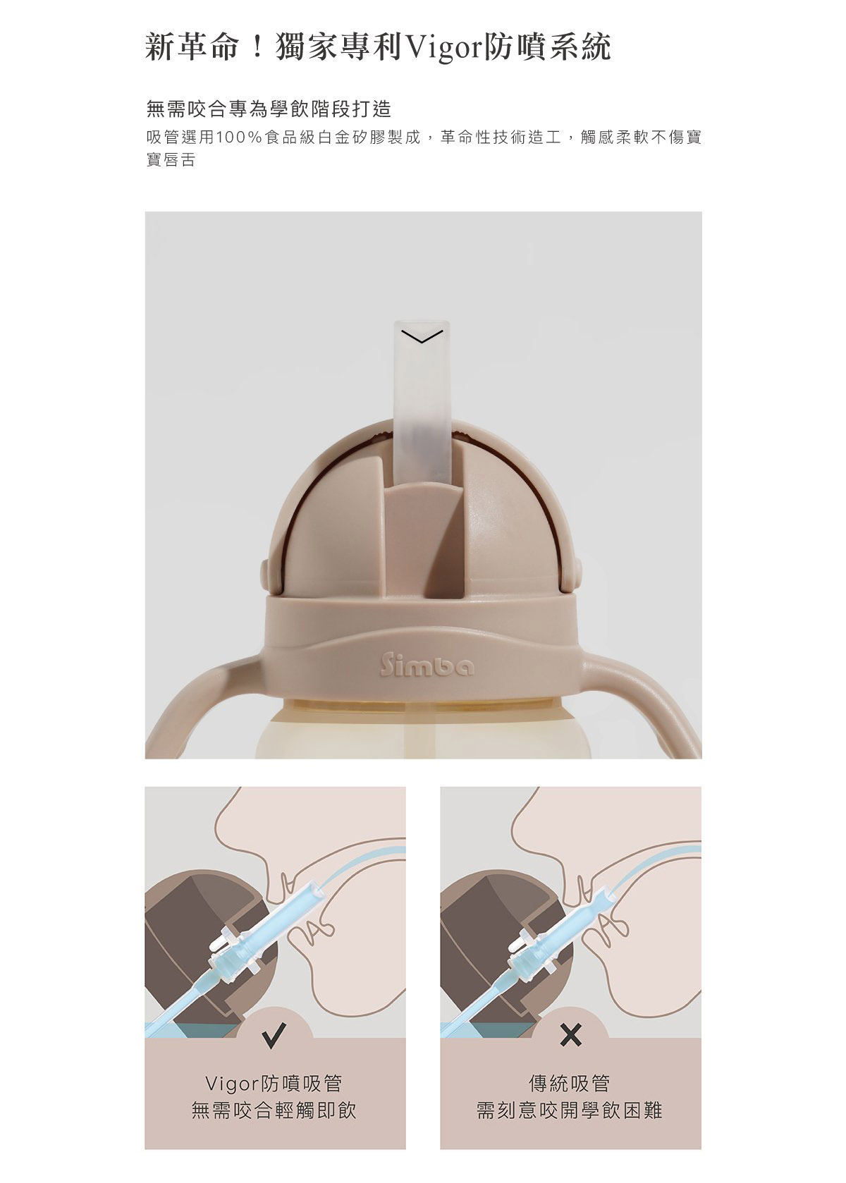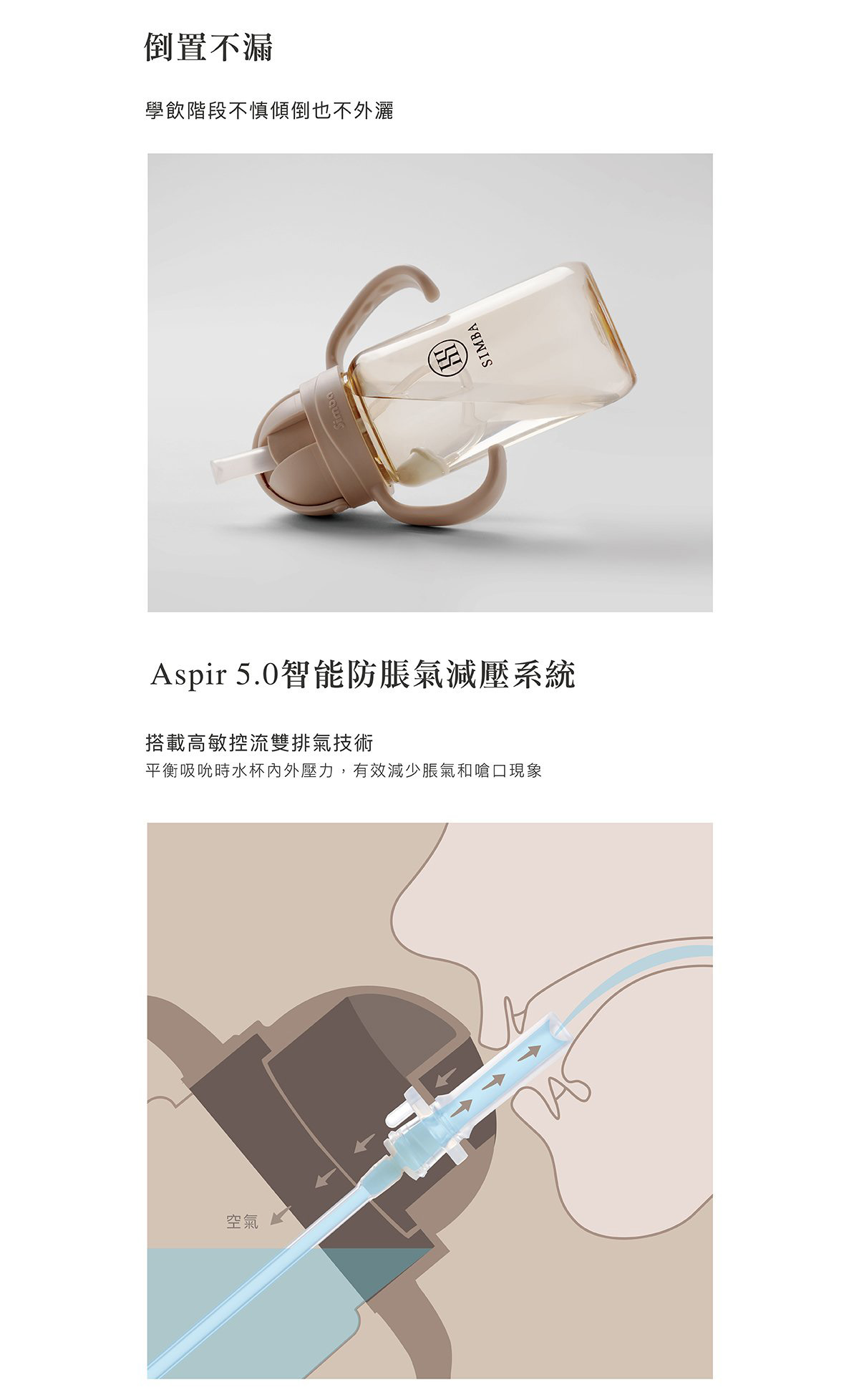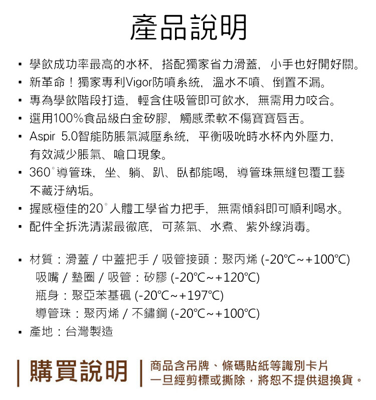 【商品特色】學飲成功率最高的水杯,搭配獨家省力滑蓋,小手也好開好關。新革命!獨家專利Vigor防噴系統,溫水不噴、倒置不漏。專為學飲階段打造,輕含住吸管即可飲水,無需用力咬合。選用100%食品級白金矽膠,觸感柔軟不傷寶寶唇舌。Aspir 5.0智能防脹氣減壓系統,平衡吸吮時水杯內外壓力,有效減少脹氣、嗆口現象。360?導管珠,坐、躺、趴、臥都能喝,導管珠無縫包覆工藝不藏汙納垢。握感極佳的20?人體工學省力把手,無需傾斜即可順利喝水。配件全拆洗清潔最徹底,可蒸氣、水煮、紫外線消毒。【商品規格】材質:聚丙烯 (-20℃~+100℃)+矽膠 (-20℃~+120℃)+聚亞苯基? (-20℃~+197℃)+聚丙烯/不鏽鋼 (-20℃~+100℃),商品尺寸:270ml