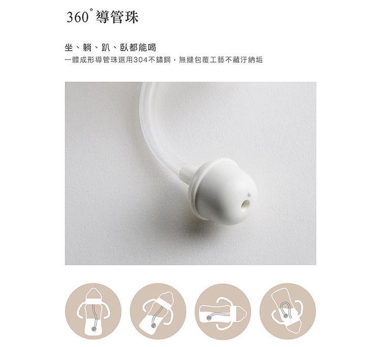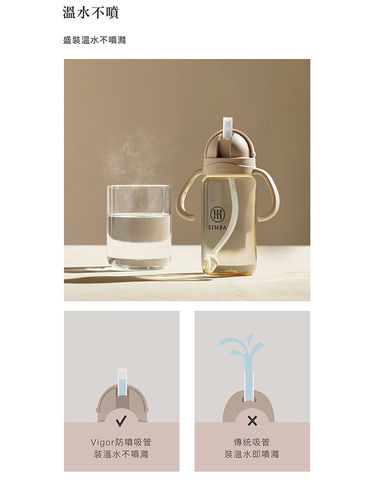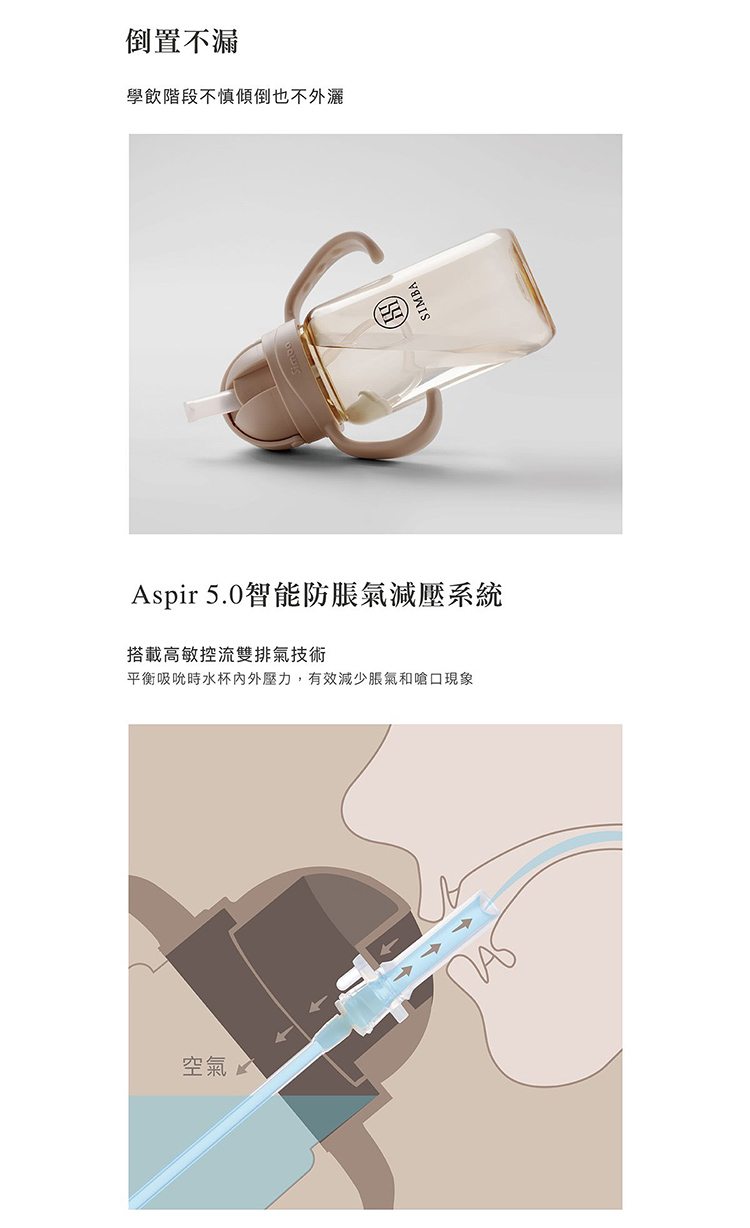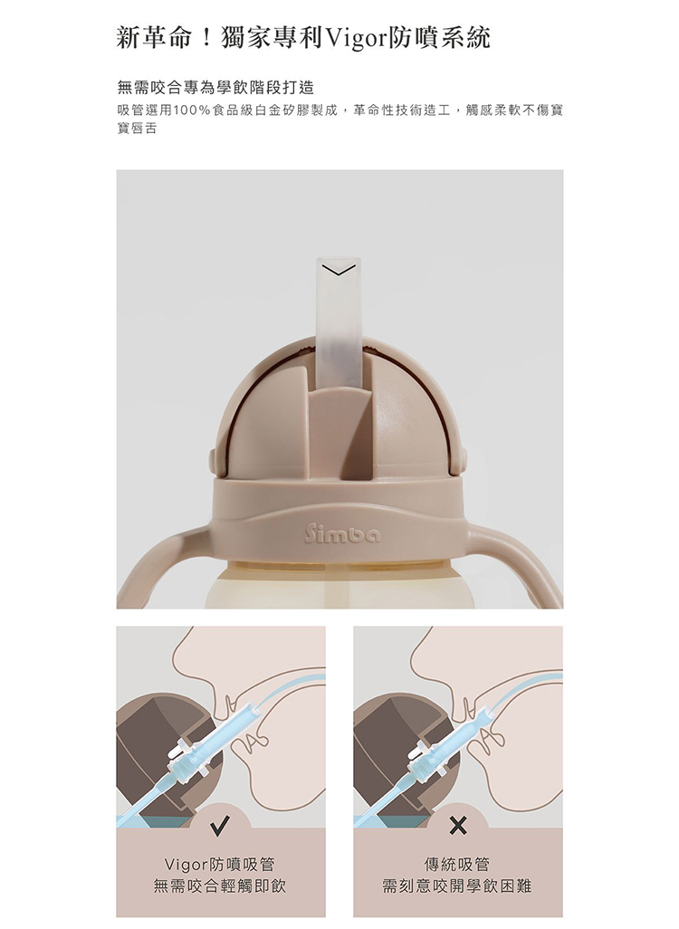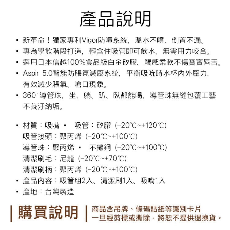 【商品特色】新革命!獨家專利Vigor防噴系統,溫水不噴、倒置不漏。專為學飲階段打造,輕含住吸管即可飲水,無需用力咬合。選用日本信越100%食品級白金矽膠,觸感柔軟不傷寶寶唇舌。Aspir 5.0智能防脹氣減壓系統,平衡吸吮時水杯內外壓力,有效減少脹氣、嗆口現象。360?導管珠,坐、躺、趴、臥都能喝,導管珠無縫包覆工藝不藏汙納垢。【商品規格】材質:矽膠(-20℃~+120℃)+聚丙烯(-20℃~+100℃)聚丙烯 ‧ 不鏽鋼(-20℃~+100℃)+尼龍(-20℃~+70℃)+聚丙烯(-20℃~+100℃),商品尺寸:270ml