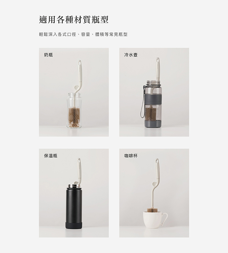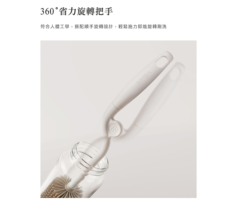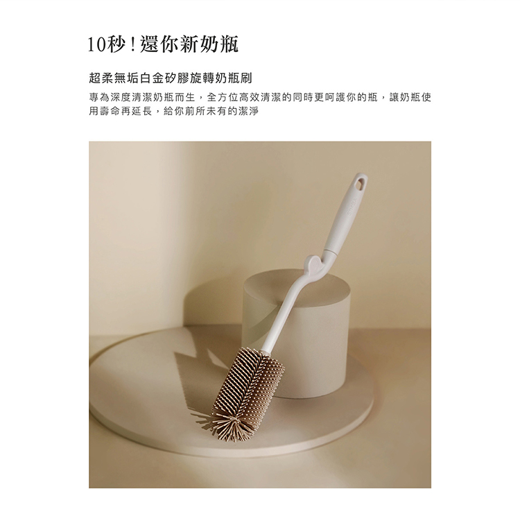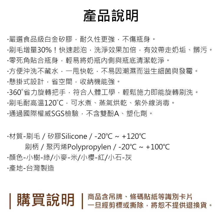 【商品特色】嚴選食品級白金矽膠,耐久性更強,不傷瓶身。刷毛增量30%!快速起泡,洗淨效果加倍,有效帶走奶垢、髒污。零死角貼合瓶身,輕易將奶瓶內側與瓶底清潔乾淨。方便沖洗不藏水,一甩快乾,不易因潮濕而滋生細菌與發霉。懸掛式設計,省空間,收納機能強。360?省力旋轉把手,符合人體工學,輕鬆施力即能旋轉刷洗。刷毛耐高溫120?C,可水煮、蒸氣烘乾、紫外線消毒。通過國際權威SGS檢驗,不含雙酚A、塑化劑。【商品規格】材質:刷毛/矽膠Silicone/-20℃ ~ +120℃、刷柄/聚丙烯Polypropylen/-20℃ ~ +100℃,商品尺寸:31x5cm