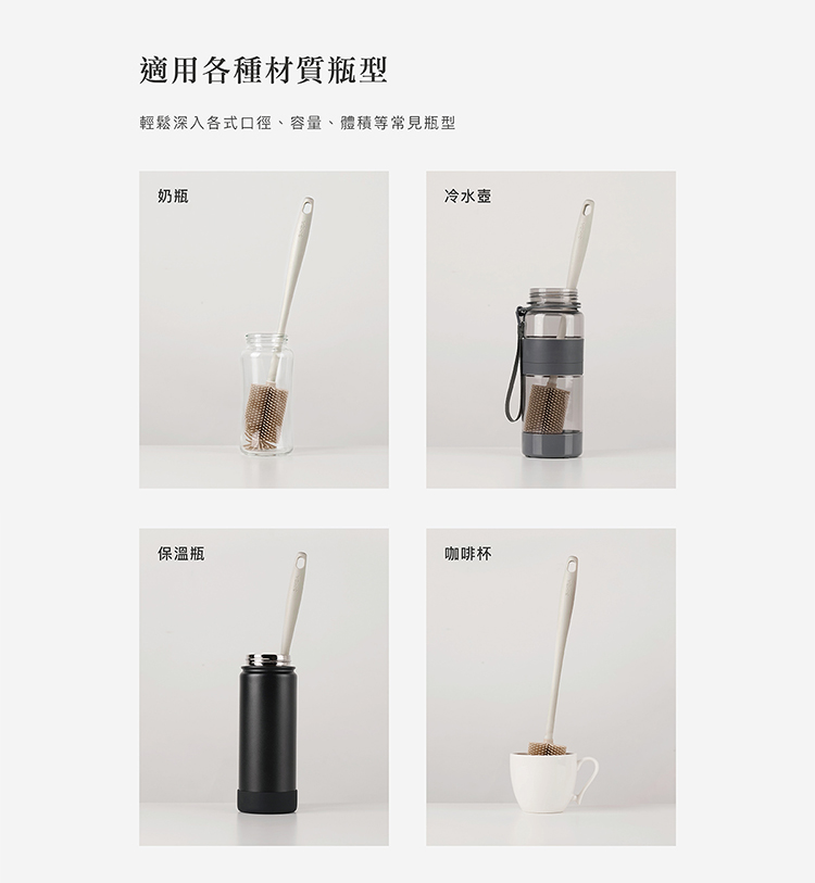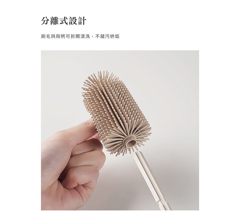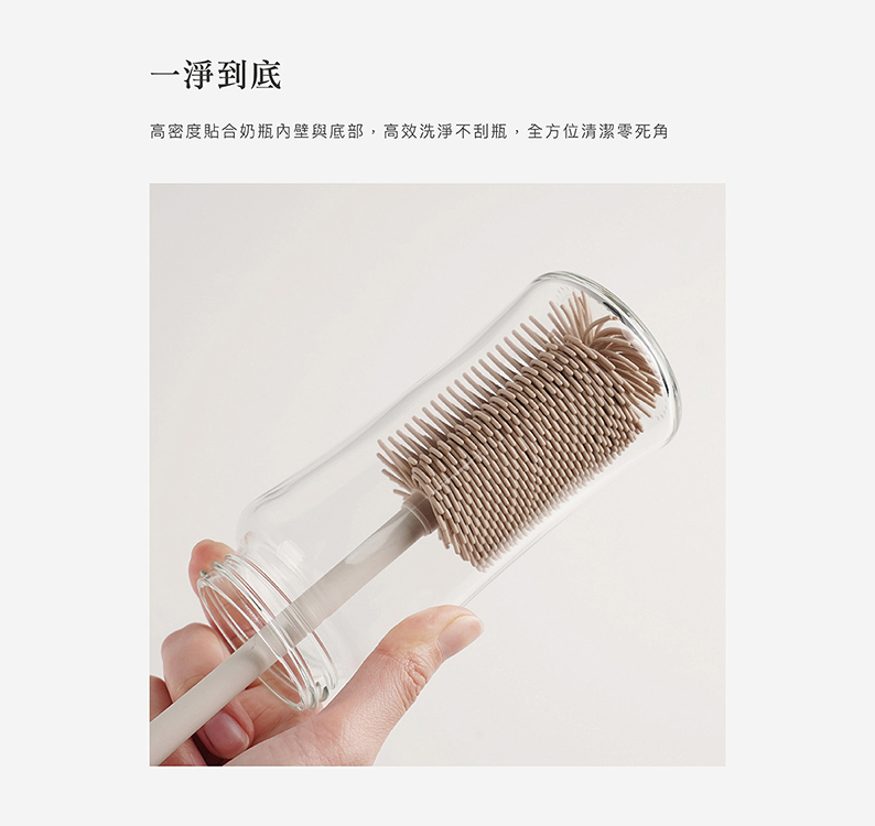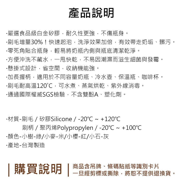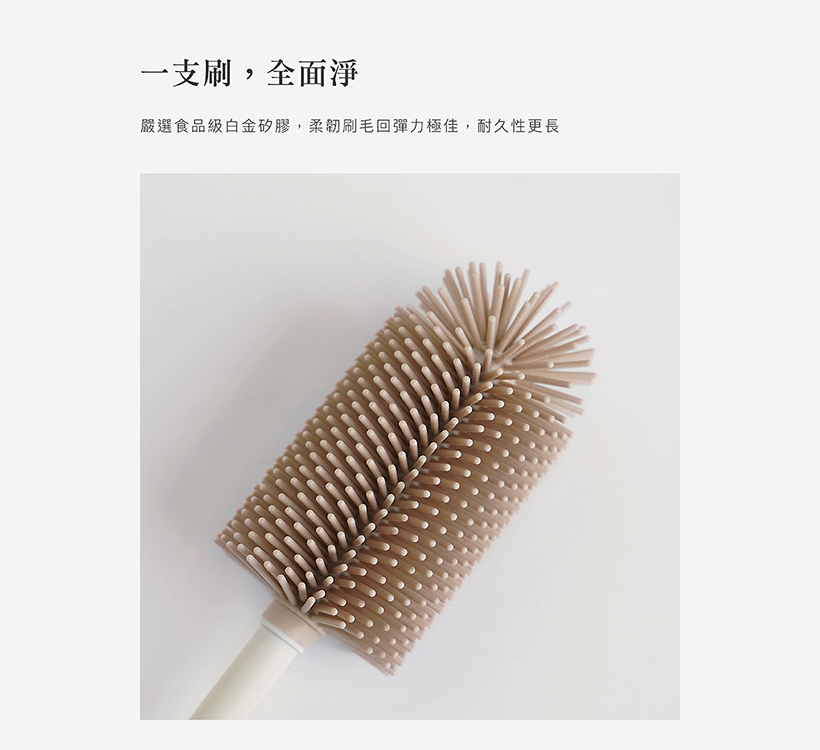 【商品特色】嚴選食品級白金矽膠,耐久性更強,不傷瓶身。刷毛增量30%!快速起泡,洗淨效果加倍,有效帶走奶垢、髒污。零死角貼合瓶身,輕易將奶瓶內側與瓶底清潔乾淨。方便沖洗不藏水,一甩快乾,不易因潮濕而滋生細菌與發霉。懸掛式設計,省空間,收納機能強。加長握柄,適用於不同容量奶瓶、冷水壺、保溫瓶、咖啡杯。刷毛耐高溫120?C,可水煮、蒸氣烘乾、紫外線消毒。通過國際權威SGS檢驗,不含雙酚A、塑化劑。【商品規格】材質:刷毛/矽膠Silicone/-20℃ ~ +120℃、刷柄/聚丙烯Polypropylen/-20℃ ~ +100℃,商品尺寸:32x5cm