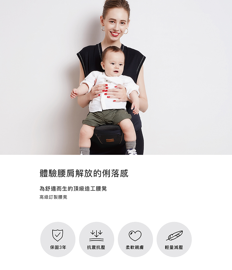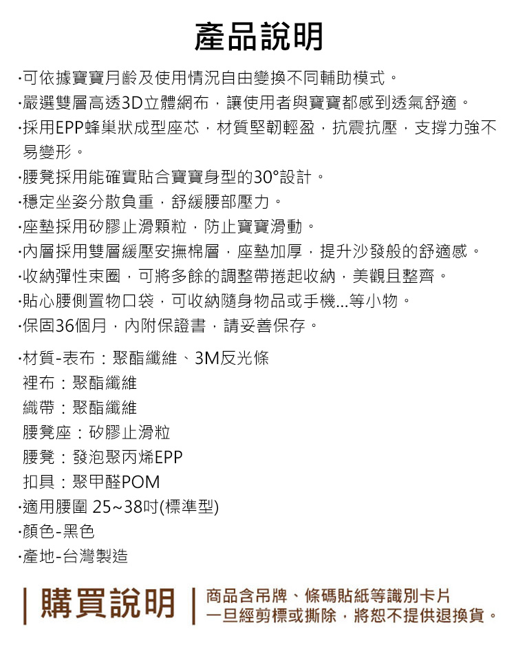 【商品特色】可依據寶寶月齡及使用情況自由變換不同輔助模式。嚴選雙層高透3D立體網布,讓使用者與寶寶都感到透氣舒。採用EPP蜂巢狀成型座芯,材質堅韌輕盈,抗震抗壓,支撐力強不易變形。腰凳採用能確實貼合寶寶身型的30°設計。穩定坐姿分散負重,舒緩腰部壓力。座墊採用矽膠止滑顆粒,防止寶寶滑動。內層採用雙層緩壓安撫棉層,座墊加厚,提升沙發般的舒適感。收納彈性束圈,可將多餘的調整帶捲起收納,美觀且整齊。貼心腰側置物口袋,可收納隨身物品或手機…等小物。保固36個月,內附保證書,請妥善保存。【商品規格】材質:表布:聚酯纖維、3M反光條/裡布:聚酯纖維/織帶:聚酯纖維/腰凳座:矽膠止滑粒/腰凳:發泡聚丙烯EPP/扣具:聚甲醛POM,商品尺寸:25~38吋(標準型)
