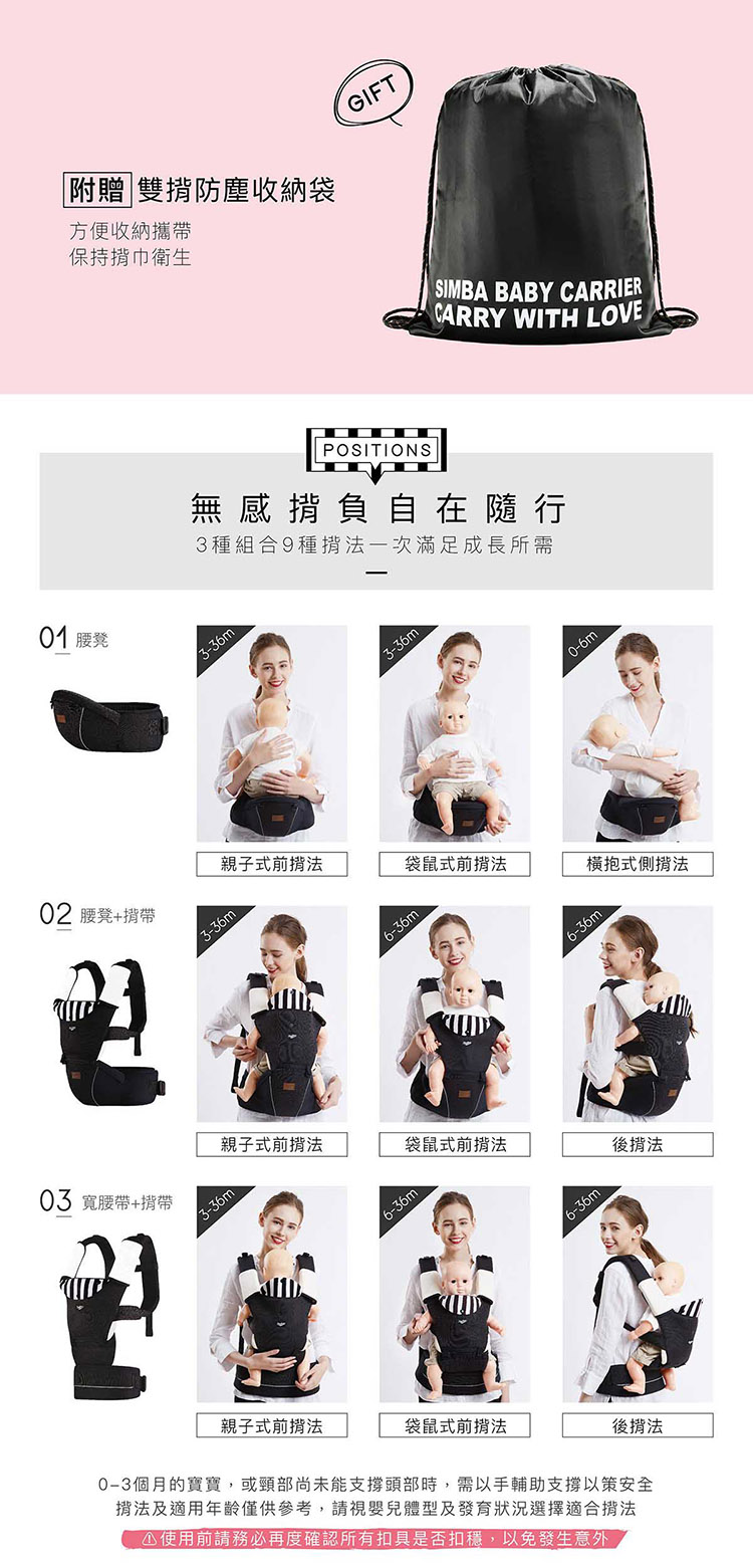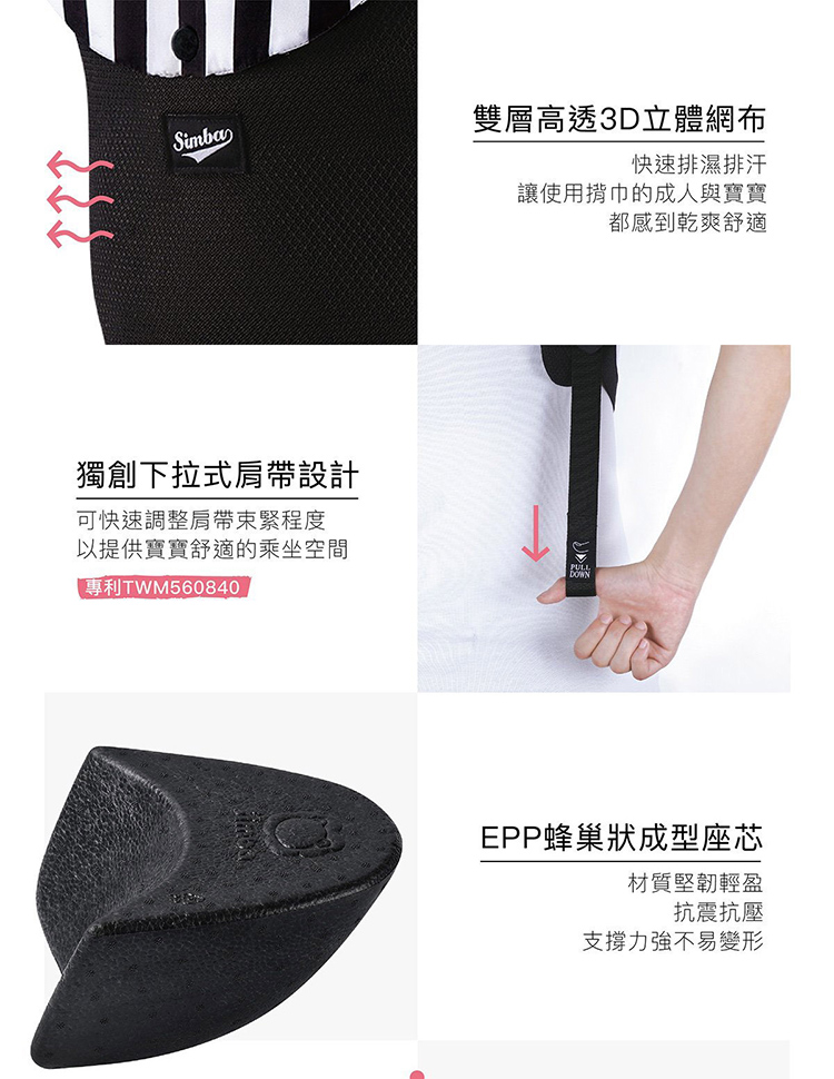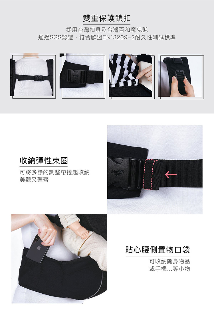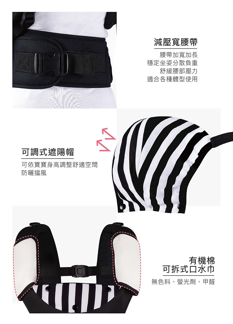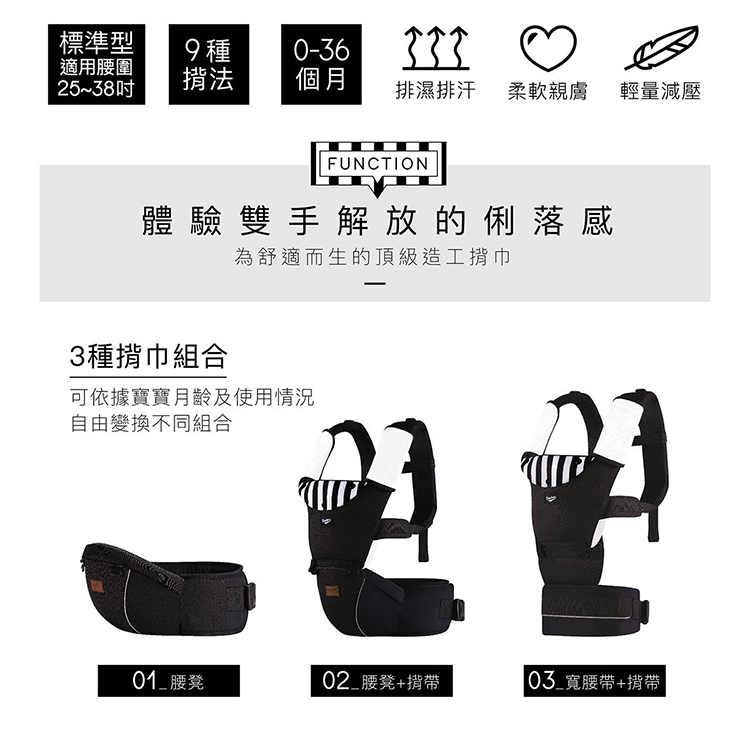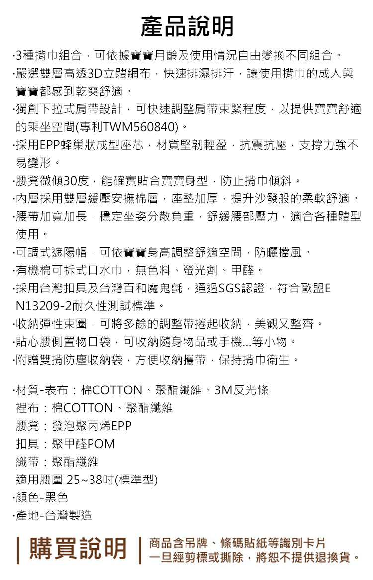 【商品特色】3種揹巾組合,可依據寶寶月齡及使用情況自由變換不同組合。嚴選雙層高透3D立體網布,快速排濕排汗,讓使用揹巾的成人與寶寶都感到乾爽舒適。獨創下拉式肩帶設計,可快速調整肩帶束緊程度,以提供寶寶舒適的乘坐空間(專利TWM560840)。採用EPP蜂巢狀成型座芯,材質堅韌輕盈,抗震抗壓,支撐力強不易變形。腰凳微傾30度,能確實貼合寶寶身型,防止揹巾傾斜。內層採用雙層緩壓安撫棉層,座墊加厚,提升沙發般的柔軟舒適。腰帶加寬加長,穩定坐姿分散負重,舒緩腰部壓力,適合各種體型使用。可調式遮陽帽,可依寶寶身高調整舒適空間,防曬擋風。有機棉可拆式口水巾,無色料、螢光劑、甲醛。採用台灣扣具及台灣百和魔鬼氈,通過SGS認證,符合歐盟EN13209-2耐久性測試標準。收納彈性束圈,可將多餘的調整帶捲起收納,美觀又整齊。貼心腰側置物口袋,可收納隨身物品或手機…等小物。附贈雙揹防塵收納袋,方便收納攜帶,保持揹巾衛生。【商品規格】材質:表布:棉COTTON、聚酯纖維、3M反光條/裡布:棉COTTON、聚酯纖維/腰凳:發泡聚丙烯EPP/扣具:聚甲醛POM/織帶:聚酯纖維,商品尺寸:25~38吋(標準型)