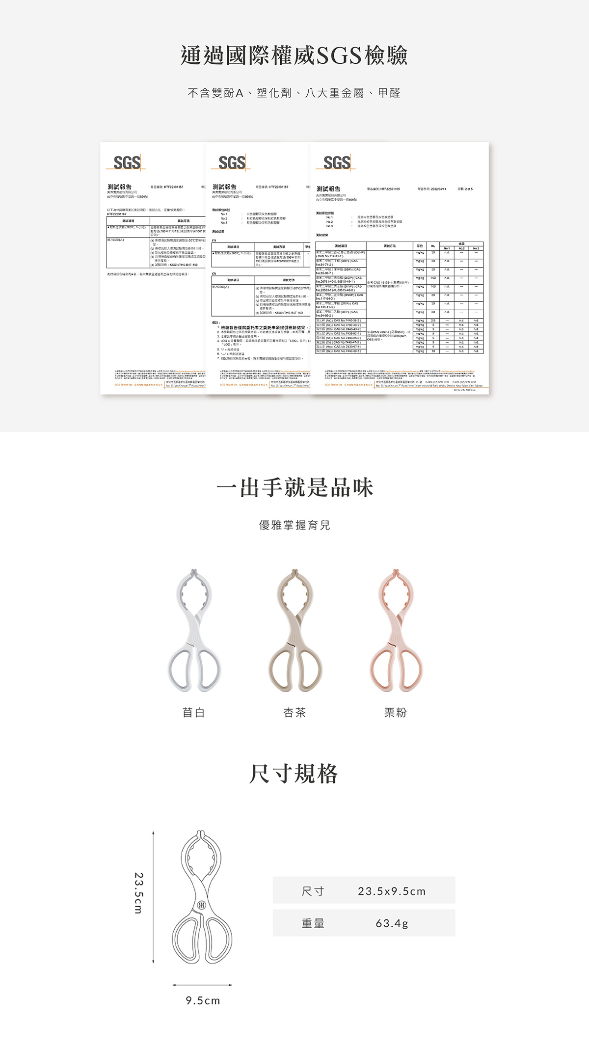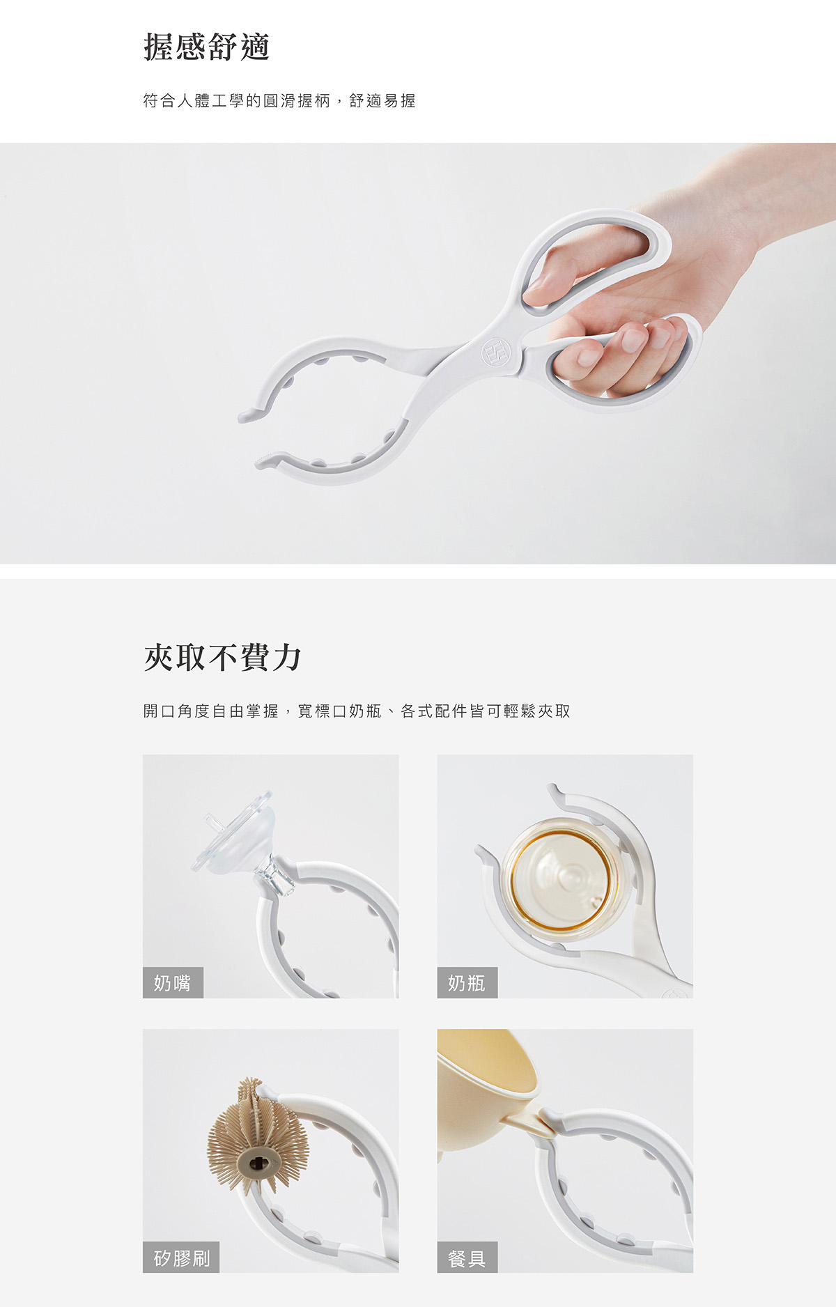 【商品特色】採用PP、TPR複合性耐熱材質,特殊長柄設計,可避免拿取時被燙傷的風險。特殊凸點夾合設計,不易滑落且不刮傷瓶身。符合人體工學的圓滑握柄,舒適易握。開口角度自由掌握,寬標口奶瓶、各式配件皆可輕鬆夾取。支點可拆卸,不藏汙納垢,清潔無死角。嚴選耐熱材質,耐高溫達100?C,可水煮、蒸氣、紫外線消毒。通過國際權威SGS檢驗,不含雙酚A、塑化劑、八大重金屬、甲醛。【商品規格】材質:聚丙烯Polypropylene/熱可塑性橡膠TPR (-20℃~+100℃),商品尺寸:23.5x9.5cm