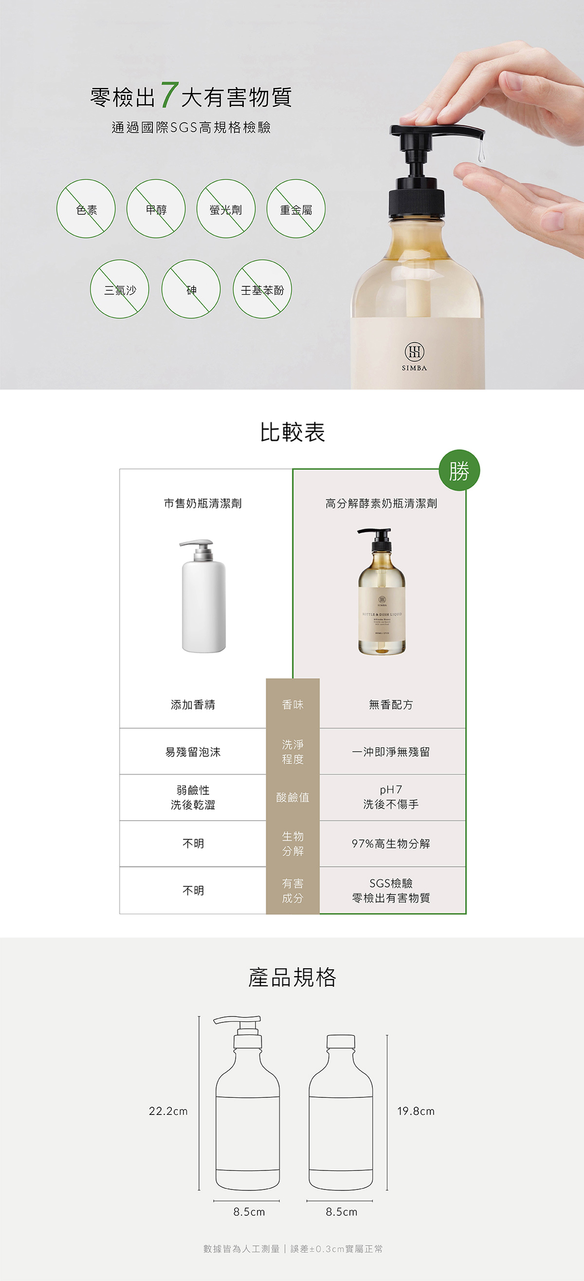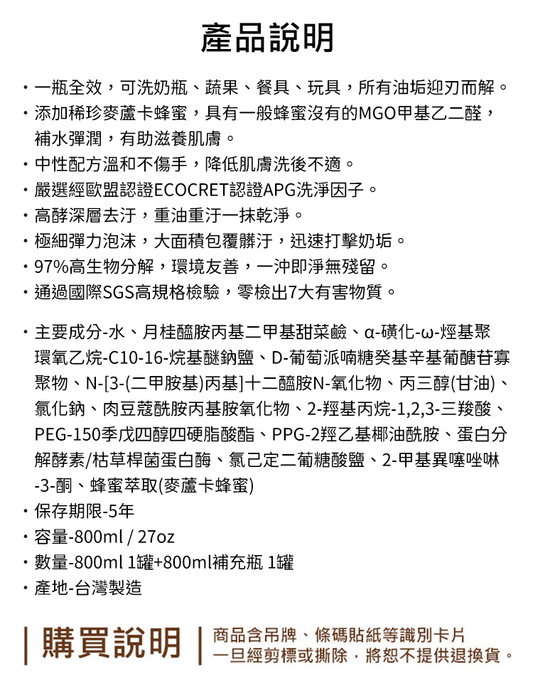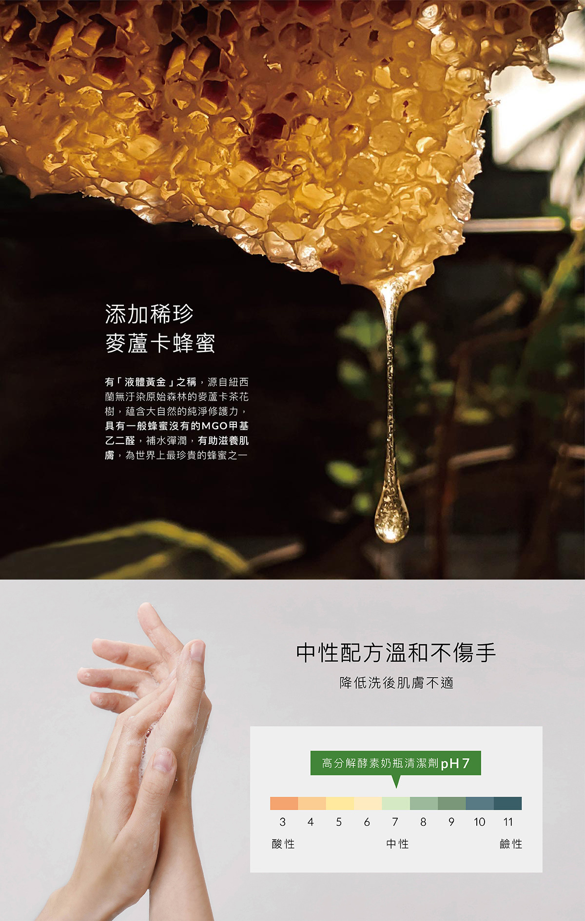 【商品特色】強酵出擊!秒分解奶垢。成分突破性升級,添加稀珍麥蘆卡蜂蜜,有助滋養肌膚,頻繁洗也不乾手!【商品規格】材質:水、月桂醯胺丙基二甲基甜菜鹼、α-磺化-ω-烴基聚環氧乙烷-C10-16-烷基醚鈉鹽、D-葡萄派喃糖癸基辛基葡醣苷寡聚物、N-[3-(二甲胺基)丙基]十二醯胺N-氧化物、丙三醇(甘油)、氯化鈉、肉豆蔻酰胺丙基胺氧化物、2-羥基丙烷-1,2,3-三羧酸、PEG-150季戊四醇四硬脂酸酯、PPG-2羥乙基椰油酰胺、蛋白分解酵素/枯草桿菌蛋白酶、氯己定二葡糖酸鹽、2-甲基異噻唑啉-3-酮、蜂蜜萃取(麥蘆卡蜂蜜),商品尺寸:800ml / 27oz