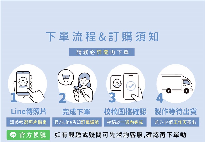 加官方Line傳照片>完成下單>校稿圖檔確認>製作等待出貨