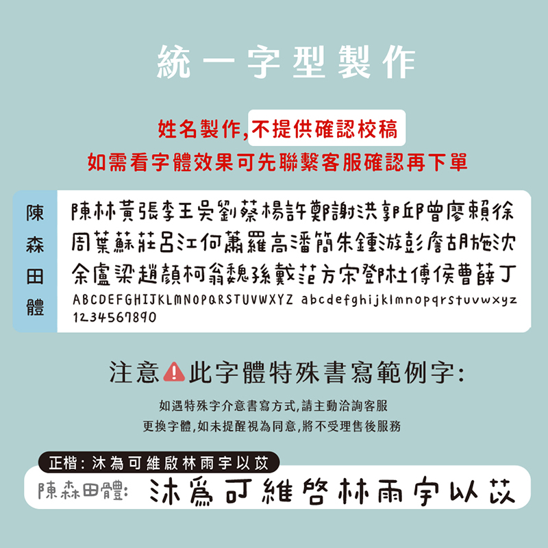 ■姓名依填寫內容製作,不再另外做確認校稿,如需看字體效果可先聯繫客服確認再下單