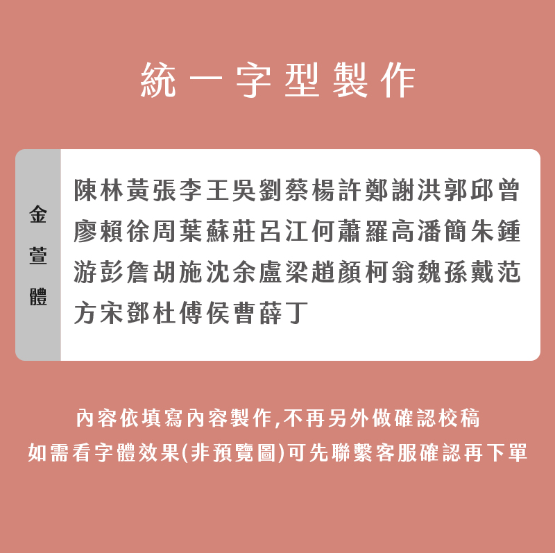■內容依填寫內容製作,不再另外做確認校稿,如需看字體效果(非預覽圖)可先聯繫客服確認再下單