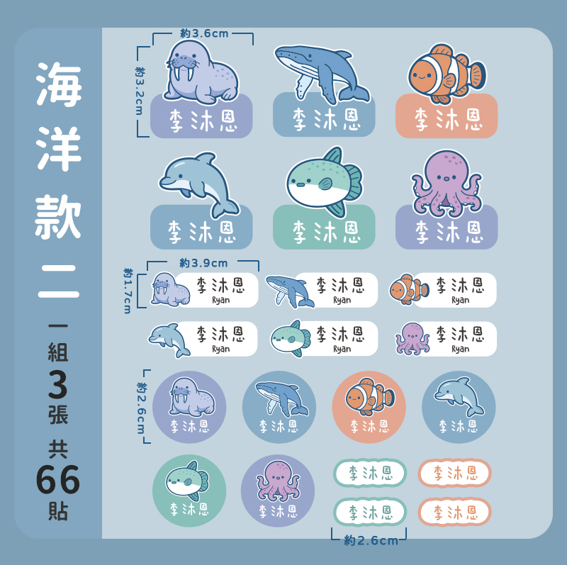 一組3大張,每張皆含不同尺寸與圖案,共66張燙印貼